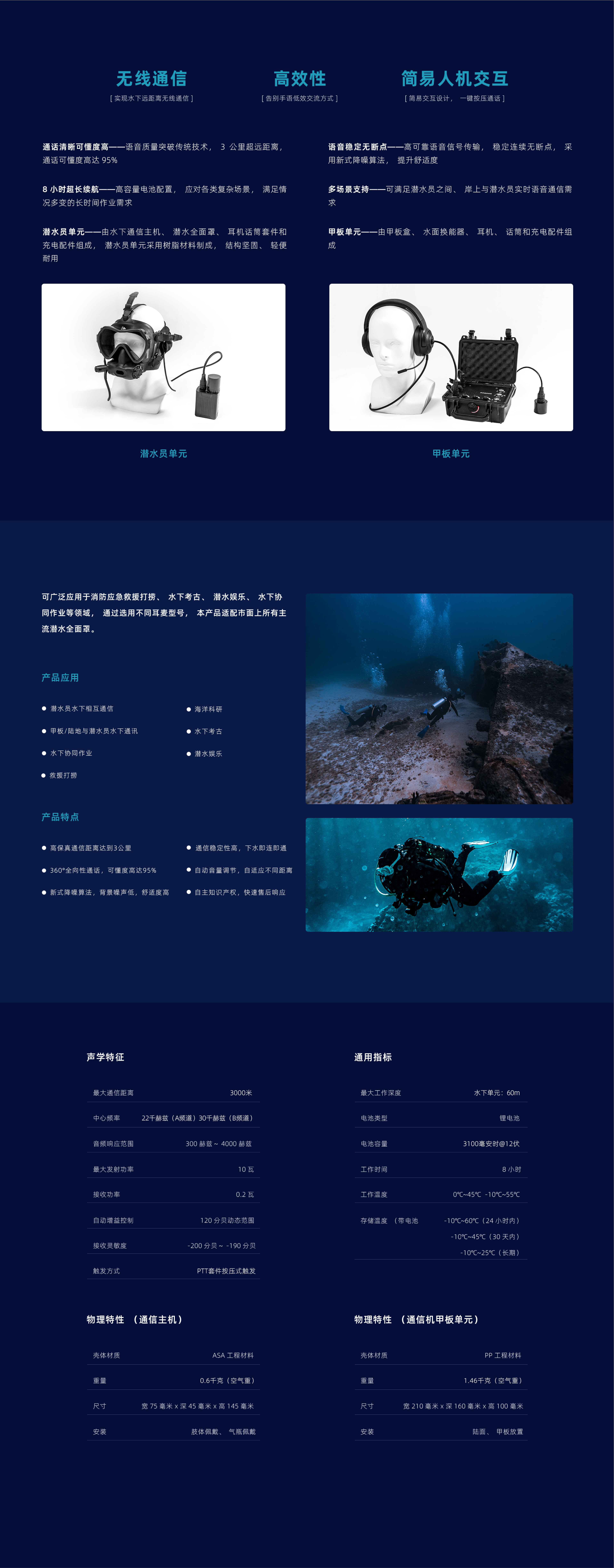 深海通语音通信机深海通水声语音通信机 声学特征 **通信距离 3000米(海洋环境、清澈水质) 中心频率 22千赫兹(从频道)30千赫兹(由频道) 音频响应范围 300赫兹~4000赫兹 **发射功率 15瓦 接收功率 1.5瓦 自动增益控制 120分贝动态范围 接收灵敏度 -200分贝~190分贝(工作频段内) 触发方式 PTT套件按压式触发 通用指标 **工作深度 60米 电池类型 锂电池 电池容量 3100毫安时@12伏 工作时间 8小时(按10%使用率计算) 待机24小时 工作温度 0℃~45℃(设备电池充电) -10℃~55℃(设备放电工作) 储存温度(带电池) -10℃~60℃(24小时内) -10℃~45℃(30天内) -10℃~25℃(长期) 供电 直流12伏,2安 水下主机物理特性 壳体材料 PC 重量 0.51千克(空气重) 尺寸 宽77毫米 x 深51毫米 x 高147毫米 安装方式 肢体佩戴 气瓶佩戴 甲板盒物理特性 壳体材料 PPT工程材料 重量 1.73千克(空气重) 尺寸 长252毫米 x 宽173毫米 x 高101毫米 安装方式 陆面、甲板放置
